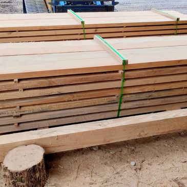 Rough-cut boards, fence posts, porch beams, and trailer decking — pressure-treated or green. Sized to your specs and delivered on time.